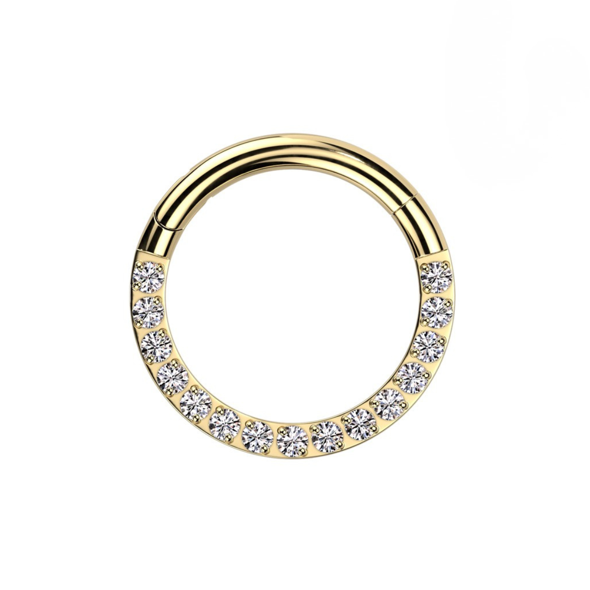 This titanium hinged segment hoop features forward facing pavé set cubic zirconia designed to sit neatly along the front of the piercing for a bright, clean sparkle.