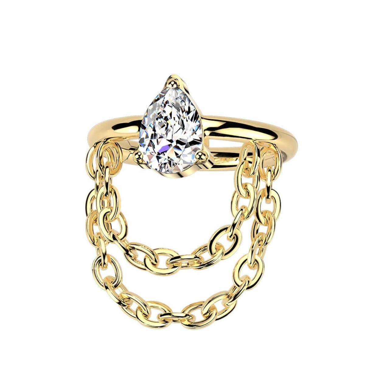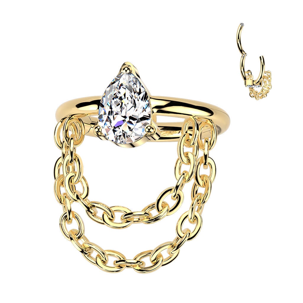 This titanium hinged segment ring features a teardrop cut cubic zirconia with double chains for a bit of extra movement and sparkle.